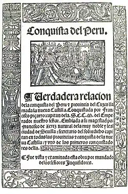 Following the successful campaign of the Battle of Cajamarca in 1532, Francisco Pizarro designated Xerez as his personal secretary and offered him a significant amount of gold the Inca Emperor Atahualpa had paid as a ransom. Xerez wrote with all detail about the events that preceded the Spanish conquest and the first encounter Pizarro had with Atahualpa in Cajamarca.[1][2][3][4][5][6][7][8][9][10][11] During this time Xerez fractured one of his legs and returned to Seville, where his narrations about the conquest of Peru were published as the "Verdadera Relación de la conquista del Perú" in June 1534.