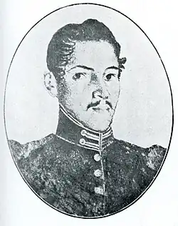 His first child, Manuel Santander, was born when Santander was only 19 years old and a second lieutenant in the National Guard Battalion while he was posted in the town of Honda with a local woman of that town.[80] His second son Francisco de Paula Jesús Bartolomé Santander Piehdrahita, was born on August 23, 1833, to Paz Piehdrahita Saenz, despite being born out of wedlock Santander recognized him as his legitimate son in his testament, and also referred to him affectionately by his nickname "Pachito". "Pachito" would follow his father's footsteps and served in the Colombian military reaching the rank of general and would pass away in 1916.[81]