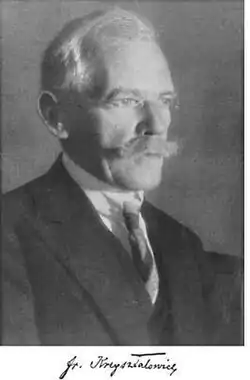 Franciszek Krzyształowicz (1868 – 1931) was a Polish dermatologist. He served as the rector of the University of Warsaw from 1924 to 1925. In 1919 he became the professor and head of dermatology at the University of Warsaw. He was one of the founders of the Polish Dermatological Society, and from 1927 to 1930 he was its chairman.