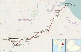 The Ethio-Djibouti Railway is a 1,000 mm (3 ft 3+38 in) gauge railway built in 1897–1917. The line connected the new Ethiopian capital city of Addis Ababa (1886) to the Port of Djibouti in French Somaliland, providing landlocked Ethiopia with railway access to the sea. The railway is single track and stretched 784 km, of which about 100 km lay in Djibouti.[4]