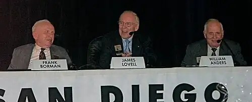 Following John Glenn's death in December 2016, Borman became the oldest living American astronaut. He was eleven days older than his Apollo 8 crewmate, Jim Lovell.[140] Both celebrated their 90th birthdays in March 2018.[141] Borman gave the commencement address to the University of Arizona's 2008 graduating class,[142] and was reunited with Lovell and Anders for celebrations of the 50th anniversary of Apollo 8 in December 2018 at the Museum of Science and Industry in Chicago, where the spacecraft in which they orbited the Moon is on display.[143] "I have never said it before publicly", declared Borman, "but these two talented guys, I'm just proud that I was able to fly with them. It was a tough job done in four months, and we did a good job."[143]