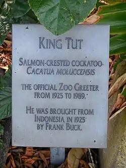 King Tut appeared in several films, television shows, and theater productions, and was the "official greeter" of the zoo for decades, sitting on a perch inside the entrance to squawk at guests[44][45][48][49] Following King Tut's death in 1990, a bronze statue of the cockatoo was placed in the location of its longtime perch and remains there today, its plaque indicating that the bird "was brought from Indonesia in 1925 by Frank Buck".[49][50]