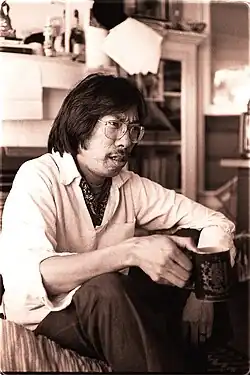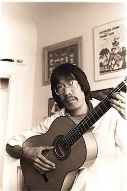 Frank Chin was born in Berkeley, California on February 25, 1940. His grandfather worked on the Western Pacific Railroad.[2] He remained under the care of a retired vaudeville couple in Placerville, California until he was 6.[3] At that time, his mother brought him back to the San Francisco Bay Area and thereafter Chin grew up in Oakland Chinatown.[3][4][5] He attended the University of California, Berkeley, where he contributed to the California Pelican.[6] He graduated from the University of California, Santa Barbara in 1965.[3] According to Chin, who had returned from a sabbatical working as the first Chinese brakeman for the Southern Pacific railroad, he intimidated a dean into graduating him with a bachelor's degree in English: "[I said] 'I want a decision by Friday' and he said, 'Well, I'm a very busy man,' and I said, 'You're a working stiff like me - you have a decision Friday and I don't care what it is. Either I've graduated or I haven't graduated because I have to get back to work.' Friday, I walked by the office and the secretary jumps up and says: 'You've graduated!' I said, 'That's all I want to know'."[7]