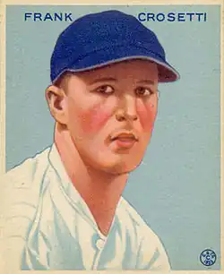 Frank Peter Joseph Crosetti (October 4, 1910 – February 11, 2002) was an American baseball shortstop. Nicknamed "the Crow", he spent his entire seventeen-year Major League Baseball playing career with the New York Yankees before becoming a coach with the franchise for an additional twenty seasons. As a player and third base coach for the Yankees, Crosetti was part of seventeen World Championship teams and 23 World Series participants overall (1932–1964), the most of any individual.
