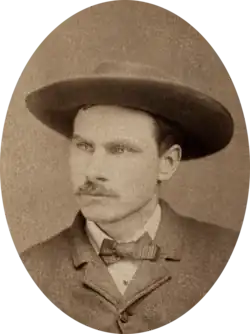 Frank Butler was born in County Longford, Ireland, and moved with his family to the United States at the age of 13.[1] While Butler's birth date is listed on his and Oakley's U.S. passport application as February 25, 1852, the obituary for Butler posted by the Associated Press in 1926 has his age as 76, which meant he was born in 1850.[2] According to baptism registers on file at the National Library of Ireland, Butler was baptized on January 30, 1847.[3][4] His parents were Michael Butler and Catherine Whelan.[1][5][3] He was the oldest of their five children.[1][6] He initially worked a series of odd jobs, including one as a glass blower, while living near Camden, New Jersey.[6] Butler married Henrietta Saunders around 1870; they had two children, Edward and Katie.[6][7] The two divorced a few years later.