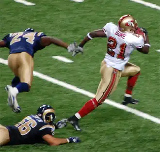 Gore finished the season with eight rushing touchdowns, tied for the third-most in a season by a 49er.[60] He finished the season with a team-leading 61 receptions.[61] Only two other teams had a running back as their leading receiver: New Orleans (Reggie Bush) and Philadelphia (Brian Westbrook). Of those, only Gore and Westbrook also led their team in rushing. Gore also caught his first receiving touchdown of his career on the road against the Seahawks when quarterback Alex Smith avoided a sack and found Gore along the left sideline for a 20-yard score. Gore led the NFL with 16 rushes for 20 or more yards. Gore earned NFC Offensive Player of the Week honors twice during the 2006 season. He earned the honor in Week 5 after rushing for 134 yards on 27 carries and catching three passes for 38 yards against the Oakland Raiders.[62] In addition, he won in Week 11 after his franchise-record 212 rushing yards, and 26 yards on four receptions, against the Seahawks.[63] After Gore's tremendous season, he was named the starting running back to the NFC Pro Bowl team in his first Pro Bowl nomination.[64]