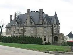 The mansion was built in 1891 for the Buhl family, which owned the Sharon Iron Works. The ashlar sandstone residence has 2+1⁄2 storeys. Noted Youngstown architect Charles Henry Owsley (1846–1935) designed it in the Richardsonian Romanesque style. The mansion features round arches, steep gable wall dormers, an inset porch with heavy arches, stone finials, and several turrets with copper capped spires. Although the house had been converted to apartments, it was restored. It currently operates as a bed and breakfast and wedding venue.[2][3][4]
