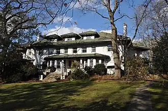 The Frank H. Stewart House is a historic house at 41 Montvale Road in Newton, Massachusetts. The 2+1⁄2-story stucco-clad house was built in 1909 for Frank H. Stewart, a lawyer. It is located in an Olmsted-designed subdivision, and is one Newton's finest large Classical Revival houses. It has a green tile hipped roof with exposed rafter ends, pierced by three hip-roofed dormers. The main facade has a front porch that merges into two flanking single-story projecting bays, all also topped by a green tile roof. There are flanking side sections fronted by porches.[2]
