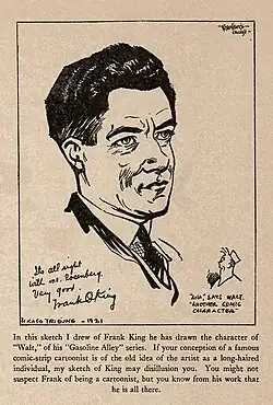Frank Oscar King (April 9, 1883 – June 24, 1969) was an American cartoonist best known for his comic strip Gasoline Alley. In addition to innovations with color and page design, King introduced real-time continuity in comic strips by showing his characters aging over generations.