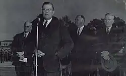 As World War II began at the end of his term, Dixon's accomplishments only increased. He oversaw a wartime reorganization of the docks in Mobile, Alabama, resulting in a four-hundred percent increase in barge traffic. Alabama's economy flourished with the shipbuilding and repairing industry brought about by the war. During World War II, Dixon oversaw some war-related events as governor. British soldiers trained in the United States as part of lend-lease; sometimes, those soldiers died in Alabama. Due to the British Army's policy of British soldiers being buried in the land where they died, Maddox set up special areas for British pilots who died in Alabama at The Oakwood Cemetery Annex; they were "given a place of their own over which flew the Union Jack." The graves were maintained by Montgomery women who were members of the Federated Garden Clubs.[2] Dixon organized a very large Armistice Day parade on November 11, 1941. Seven thousand people marched in the parade, with members from every branch of the American armed forces, including Lanier Band, Alabama State band, and the Maxwell band, as well as 3,000 U.S. Army Air Corps flying cadets and several hundred British RAF cadets. The Montgomery Advertiser commented that even though thousands lined the parade route, most people did not cheer but rather were calm, respectful, and quiet observers until the British cadets came by. At that point, the crowd did cheer, "...the British cadets alone waking applause from the onlookers."[3] Governor Dixon also organized and oversaw a "massive" USO show in Montgomery that featured Erle Danley, a music professor from Huntingdon, a choir from Alabama State sang carols, British cadets singing "God Rest Ye Merry, Gentlemen" as well as other events.[4]