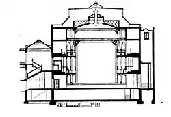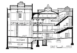 Outside of London, and prior to 1886, Matcham only had two designs commissioned, both in Glasgow: Hengler's Grand Cirque and the Royalty Theatre.[29] In 1879 he started work on the redesign of the Royalty,[30] a playhouse originally designed by James Thomson and one that had been built on the first floor of a four-storey building. The layout was problematic and Matcham had to make a series of adjustments. To compensate, he designed a ventilation system which involved the installation of an exhaust duct over the auditorium gas light which caused the heat from the burners to rise up and create a movement of air through the theatre. It was a design that he also used on the Gaiety, Matcham's second Glaswegian theatre. The Royalty took just four weeks to complete and was relatively inexpensive, two factors that helped enhance his reputation.[23]