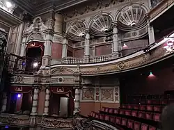 The following year Matcham was contracted by Frederick Purcell, a member of the extended Revill family,[41] to undertake the renovations of his theatre that had caught fire the year before. Matcham was afforded the benefit of being able to use the existing building, which increased the possibility of his being able to finish the project on time.[42] The same year, The Grand Cirque and Amphitheatre opened in Bolton. Matcham's design allowed for it to be used as a circus and a theatre and for the venue to be changed between the two in a few hours. It was decorated in the Italian style and had the capacity to seat 3,200 people. The circus ring eventually fell out of favour with audiences and it was covered over.[43]