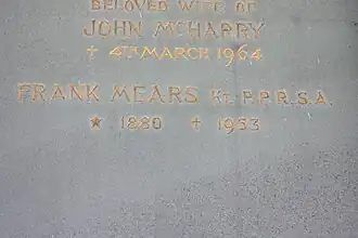 Frank Mears died in Christchurch, New Zealand whilst visiting his son, Kenneth Patrick Geddes Mears (1916–2001). His body was returned to Edinburgh for cremation. A memorial plaque is placed to his memory on the south side of Warriston Crematorium above a plaque to his other two sons both of whom died young: Alastair Mears (1918-1939) and John M. Mears (1921–1949).