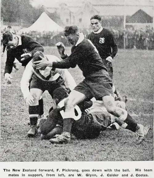 After the Auckland match with England, Pickrang returned to the Manukau side to play against Mount Albert on August 1. He scored a try and played “a great all-round game” in an 11-9 win.[48] The Herald again wrote a piece on Pickrang's play saying “an outstanding feature of the match was the great all-round game played by Pickrang in the Manukau vanguard. He was always in the picture on attack or defence and his tackling was excellent”.[49] He was then named by selectors Thomas McClymont, Jim Amos, and Bert Avery to make his New Zealand debut against England at the age of just 21 which was very rare for a forward to be so youthful. He was picked to play in the second row with Billy Glynn. The Auckland Star said that “Pickrang is the best forward in Auckland”.[50]