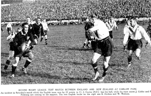 The first test (of 2) was played at Carlaw Park on August 8. New Zealand went down narrowly by 10 points to 8 with Pickrang said to have “played a magnificent game”.[51] Early in the test with New Zealand “harassing” England Pickrang broke away, but Roy Powell was smothered when a try looked possible”. He “repeatedly led the home forwards, who did fine work in the loose”, and was involved with Powell again before [Bill] McNeight, [Jim] Calder and [Steve] Watene became involved and just missed a try during the first half.[52] The Herald said “in fine set of forwards Pickrang stood out for a great all-round game. His fast raiding and splendid tackling were of advantage to the team.[53]