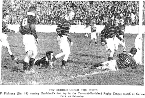 Following the trial matches Pickrang was named in the Northland squad to play Taranaki at Carlaw Park.[98] The team travelled to Auckland on the Saturday morning and went down 29 points to 13 with Pickrang scoring a try. The Auckland Star said “F. Pickrang, the former Ponsonby and Manukau forward, was one of the best forwards on the ground, and from first to last he was going great guns for Northland.[99] A photograph of Pickrang's try was published in the New Zealand Herald with him playing on the ball next to the right hand upright at the northern end of Carlaw Park.[100] The Herald also stated he “showed some of his old-time form, and was the outstanding Northland forward”.[101] The Northern Advocate said “he was a “worrier” all the way, in the scoring list, and made openings which only occasionally were profited by”.[102] He then returned to Whangārei and played for City against Portland on July 8. This was to be his last game of rugby league.