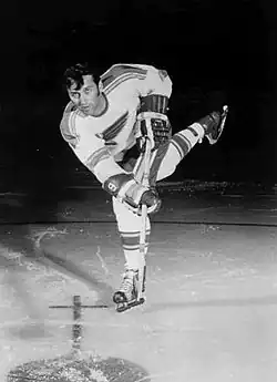 At this point, he had worked his way through the minors and was coming off the 1967 season with Port Huron; he was named to the league's second all-star team and had been signed by the expansion team St. Louis Blues.[4] The 1967 NHL expansion opened up a whole new world of opportunities for eager young newcomers, many of whom likely would have taken far different career paths if the league had remained a closed Original Six entity. St-Marseille began playing for a minor-league team, the Kansas City Blues, mainly as an affiliate of the St. Louis Blues. However, only 11 games in with the team, St-Marseille was called up by Scotty Bowman along with his linemates Gary Sabourin and Terry Crisp. Bowman was quoted as saying they "were better than our third line in St. Louis" referring to Frank, Gary, and Terry.[5] Known as a defensive-minded forward, St-Marseille often played on checking lines that were assigned to play against the opponent's top scoring line. Despite this, he still averaged 16 goals per season during a 5-year stretch with St. Louis that saw the Blues reach three straight Stanley Cup finals (losing to the Montreal Canadiens twice and the Boston Bruins).[4][6] He made the 1970 West Division All-Star team playing with great hockey legends such as Bobby Clarke and teammate Jacques Plante, who was the first NHL goaltender to wear a goaltender mask.[7] From 1970 to 1972 St-Marseille captained the team.[8] He also played on both the penalty killing and power play units for the Blues, had a plus/minus rating of +37 during those 5 years and sits tied for 6th on the all-time game-tying goals list for the Blues.[9] In 62 playoff games with the Blues, St- Marseille tallied 19 goals and 24 assists.