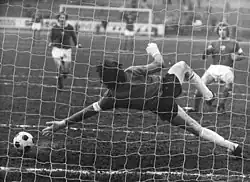 ![]() Terlezki scores a match-winning penalty goal for BFC Dynamo on goalkeeper Jürgen Croy from BSG Sachsenring Zwickau in a match on 12 April 1975. | |||||||||||||||||