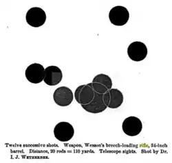 On October 7, 1863, at the Missouri State Fair, in a contest between three infantry companies, shots fired from a Wesson rifle hit a man-sized target 45 times out of 100, at a distance of 300 yards.[7] In a trial at St. Louis, competing against other rifles, a man-sized target was hit 56 times out of 100, the second best rifle scoring 10 of 100.[3] At the Massachusetts State trial of breech-loading weapons, at Readville, 20 shots in a row hit a target at 200 yards, and 50 shots were fired in 4 minutes.[8] A Dr. I.J. Wetherbee, of Boston, shot a string of 12 shots at 110 yards, with telescopic sights, with a 34-inch barreled breech-loading rifle. His target is shown here.[9]