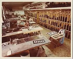 Franklin Art Glass Studios, Inc. was founded in 1924 with three principals, Wilhelm Kielblock, Wilhelm Kielmeier, and Henry ‘Elmore’ Helf. Originally located at 135 East Spring St. company’s creation was during the depression and as the depression deepened and commissions for stained glass continued to decline, Wilhelm Kielmeier pulled out of the company. This left Wilhelm Kielblock, a noted German stained glass designer and painter,[2] and Elmore Helf, a business man, to reorganize the company. Elmore Helf was not the first member of the Helf family to run a stained glass studio, his father, Henry Helf, was shop foreman for Von Gerichten Art Glass Company in Columbus, Ohio.[3] Henry worked there until the company’s closing in 1931 and passed his love and the trade of stained glass onto Elmore. To keep Franklin Art Glass alive during those difficult times the decision was made that Kielblock would relinquish his ownership of Franklin Art Glass, which was actually his portion of the debt, to Helf. Kielblock would then operate as an independent contractor under the name, Ohio Trade Studios, all the while operating in the same building as Franklin Art Glass. Through this arrangement Helf would sell the Munich – style commissions designed and painted by Kielblock’s Ohio Trade Studio. This arrangement continued until Wilhelm Kielblock’s death in 1987. After successfully riding out the depression Franklin Art Glass became a financially stable stained glass studio working on residential and liturgical commissions. In 1945 Elmore’s son, James Helf assumed control of the company after returning home from serving in WWII.[4] Business was as usual until Franklin Art Glass was approached by Wendy's Old Fashioned Hamburgers, who were building their first hamburger stand just a few blocks from Franklin’s then Oak Street location. Wendy’s interior decorator wanted to use stained glass lamps in the restaurants, and with the help of Franklin Art Glass, they designed a series of hanging lamps which would eventually become synonymous with Wendy’s restaurants. Throughout the 1960s and 1970s Franklin produced over 45,000 lampshades for Wendy’s and even expanded its employees to 40 to keep up with the demand.[5][6]