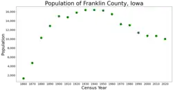 Franklin County is a county located in the U.S. state of Iowa. As of the 2020 census, the population was 10,019.[1] The county seat is Hampton.[2] The county was formed on January 15, 1851[3] and named after Benjamin Franklin.[4]
