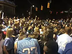 Victory celebrations: While students previously held "Beat Duke" parades on Franklin Street before sporting events,[13] today students and sports fans have been known to spill out of bars and dormitories upon the victory of one of Carolina's sports teams.[14] In most cases, “rushing” Franklin is due to a victory by the men's basketball team,[15][16] usually over Duke with Blue Devils gear as the fuel, although other Franklin Street celebrations have stemmed from wins by the women's basketball team and women's soccer team. Upon the event the men's basketball team reaches the national championship game, local stores are known to halt sales of Carolina-blue paint to avoid a repeat of the 1982 jamboree which resulted in Franklin Street being painted blue by celebrating fans. On April 6, 2009 after winning the men's basketball national championship, over 45,000 UNC fans and students crowded Franklin Street. And on April 3, 2017, more than 55,000 fans rushed Franklin Street to celebrate another men's basketball national title.