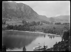 The lake is drained by the Kawarau River, which flows out from the lake's only arm, the Frankton Arm, 8 km (5.0 mi) east of Queenstown. Until about 18,000 years ago the Mataura River drained Lake Wakatipu. The Kingston Flyer follows part of the former river bed now blocked by glacial moraine.[2] Queenstown is on the northern shore of the lake close to the eastern end of its middle section. It has a seiche period of 26.7 minutes which, in Queenstown Bay, causes the water level to rise and fall some 200 millimetres (8 in).[3]