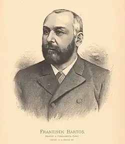 František Bartoš (16 March 1837 – 11 June 1906) was a Czech ethnomusicologist, folklorist, folksong collector and dialectologist. He is viewed as the successor of František Sušil, the pioneer of Moravian ethnomusicology. He notably organized the collecting, categorizing and editing of hundreds of Moravian folksongs which were published is a four volume collection along with about 4,000 folksongs from other ethnic traditions. The folksongs appear in ethnographic monographs and the work as a whole is viewed as one of the most important folk song collections ever published. However, Bartoš, like many other early European folk music scholars, sometimes changed the texts of the folk songs, thereby reducing the documentary value of the work.