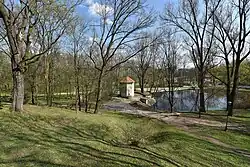 Another garden, situated north of today's Książęca Street (Princely Street), was established for Poniatowski between 1776 and 1779. The hilly garden contained many novelty and oriental structures, including a 15-metre minaret, a Chinese pavilion and a Middle Eastern outbuilding, which was dubbed by locals as the "Imam House" (Domek Imama).[9][10] None of these remain standing today with the exception of "Elizeum", an underground brick-laid rotunda and a series of corridors and tunnels which once served as a maison de plaisance retreat for the wealthy.[11] A neo-historic waterwell pavilion was erected after the Second World War, when the gardens were transformed into a public park.[12]