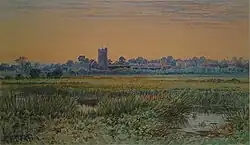 George Gordon Fraser (1859–1895), like his eldest brother Frank, showed great promise as an illustrator. His drawings and cartoons appeared in Fun magazine and he provided "upwards of one hundred and twenty illustrations" for an 1891 edition of Jerome K. Jerome's The Diary of a Pilgrimage.[7] A reprinted version of this is still available though fails to credit G.G. Fraser as the artist. He also painted, in watercolours and occasionally in oils, signing 'G. Gordon Fraser' or using his initials. William Andrew Baird Grove, in his booklet The Frasers – A Local Family of Artists (1980) describes George Gordon's work as "a wide variety of Fen scenes of painstaking detail and accuracy, no longer fashionable in today's art. His brushwork was very fine and it appears that every single twig and every leaf is given individual attention." There are noticeably fewer examples of his work in circulation as he died young, at the age of 35, having fallen through the ice while skating on the River Ouse. He was buried with his father in a secluded spot in the graveyard of St. James's Church, Hemingford Grey, a village between Huntingdon and St. Ives, Cambridgeshire.[2]: p54