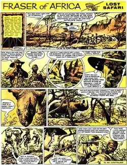Fraser of Africa is a comic strip that ran one page a week in full colour in the British comic Eagle in 1960–61, written by George Beardmore and illustrated by Frank Bellamy. It follows Martin Fraser, a white hunter in the game reserves of colonial Tanganyika, as he tracks down an American film star who has gone missing on safari, hunts down European ivory poachers, and helps a Maasai warrior rescue his tribe from Arab slavers. Bellamy, who had long had a fascination with Africa, corresponded with a farmer in Kenya who advised him on the accuracy of the wildlife depicted, and used a limited palette of browns and yellows to capture the parched East African landscape, only occasionally breaking into blues and reds. A collected edition reprinting all three stories was published by Hawk Books in 1990.