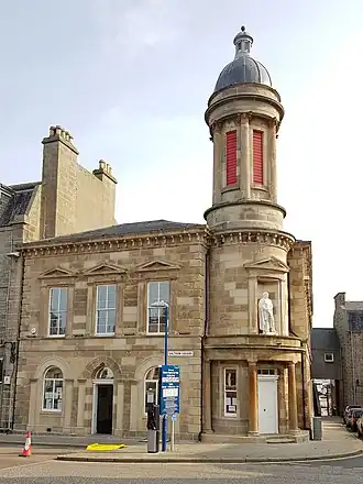The foundation stone for the new building was laid on 13 April 1853.[7] It was designed by Thomas Mackenzie of Matthews and MacKenzie in the Renaissance style, built in ashlar stone and was completed in 1855.[1][8] The design involved a symmetrical rounded frontage at the junction of Saltoun Square and Kirk Brae; it featured a doorway, with two sash windows on either side, which were flanked by Doric order columns supporting a rounded entablature. There was a rotunda with Corinthian order columns supporting a dome at roof level.[1] The other bays were fenestrated by round headed sash windows on the ground floor and by pedimented sash windows on the first floor.[1] Internally, the principal room was the council chamber.[9]