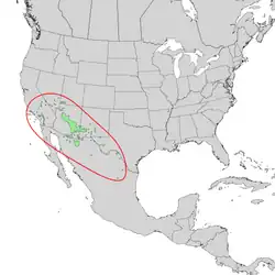 In Arizona, the range of Fraxinus velutina is centered on the Mogollon Rim, from the northwest in the Grand Canyon feeder canyons of southern Utah and Nevada, to the central-east White Mountains (Arizona) merging into the same mountainous area of western New Mexico, then to the Rio Grande valley south to trans-Pecos Texas. In Arizona and northern Sonora it also is found in the sky island mountain ranges, the Madrean Sky Islands, and is found from central-southern Arizona, in the Sonoran Desert mountains, and the desert ranges south into northern Sonora and the very north of the Sierra Madre Occidental cordillera of Sonora and Chihuahua. Scattered populations occur eastward through the Chihuahuan Desert regions of Chihuahua, Coahuila and Nuevo León.[5]