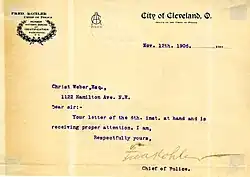 In 1889, Kohler joined the Cleveland Police and quickly rose to prominence. By 1900, he was promoted to captain and in 1903, Mayor Tom L. Johnson appointed Kohler as his chief of police.[2] He developed a reputation as a strict disciplinarian, with "all the prototypical traits of Kaiser Wilhelm's favorite field marshals."[3] He always expected the absolute maximum from all policemen, "demanding a neat appearance and full day's work."[2] While some, such as U.S. President Theodore Roosevelt, lauded him as "the best chief of police in America",[4] he was disliked by established Cleveland politicians of both parties who disapproved of his contempt for the city's machine politics.[1][3]