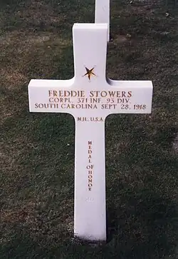 Freddie Stowers (January 12, 1896 – September 28, 1918) was an African-American corporal in the United States Army who was killed in action during World War I while serving in an American unit under 157th Infantry Division of the French Army, called the "Red Hand Division". Over 70 years later, he posthumously received the Medal of Honor and Purple Heart for his actions.