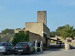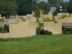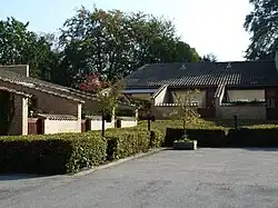 As a result of the success of the Kingo Houses, Dansk Samvirke, an organization catering to the well-being of Danish citizens who have worked for long periods abroad, invited Utzon to develop a housing estate where pensioners returning to Denmark could live together and share their experiences.[2] Utzon helped to find a suitable site in Fredensborg, for which he developed plans allowing each house to have a view over a green slope. Partly inspired by housing in Beijing's Forbidden City, the complex consists of 47 courtyard homes and 30 terraced houses as well as a central building with a restaurant, meeting rooms and nine guest rooms. The homes are all located around a square in groups of three, each with an entrance from the square.[1][3] As the houses are on a slope, they all benefit from plenty of light, especially as they face either south-east or south-west. They give a general impression of openness, which is enhanced by their comparatively large courtyard gardens, even if the houses are protected from the eyes of curious outsiders. This all contributes to a feeling of security and peacefulness.[2]