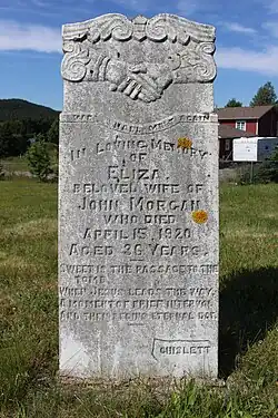 Chislett set up his shop in the corner shopfront in the range of buildings known as "Merchants Block" on Duckworth Street.[9] By 1916, Chislett was advertising in various newspapers, offering to send potential rural customers design books and photographs of his work from which they could place an order.[10] This allowed Chislett to expand business beyond the local St. John’s market, and Chislett stones can now be found in many cemeteries across the province,[2] the Methodist cemetery at Freshwater, Conception Bay, being one example.[11] Following World War I, Chislett expanded the business to create war memorials for soldiers and sailors, such as the one erected in Trinity in 1921.[12]