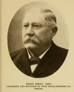 Krug led his company in Omaha for almost 50 years, and was responsible for founding Omaha's Krug Park in 1904. The city of Omaha named a street after him.[6] Frederick's sons, including William, Frederick H., Jacob and Albert all worked at the brewery in a variety of capacities.[7] Krug, a German immigrant, served on the State of Nebraska's Board of Immigration.[8]