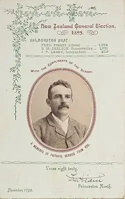 Frederick Pirani (3 December 1858 – 26 October 1926) was a New Zealand politician. He was Member of the House of Representatives for Palmerston from 1893 to 1902, first as a Liberal, then as an Independent. He was part of the Liberal Party's "left" (radical) wing.[1]
