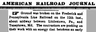 - ^ "Frederick and Pennsylvania Line progress". American Railroad Journal. 43: 817. 23 July 1870. Retrieved 12 May 2013.