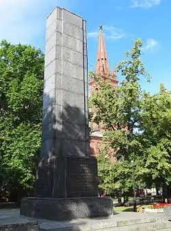 An earthen mound covered the tombstone, then the Interim Municipal Government decided to celebrate here the memory of all Red Army and Polish Army soldiers who died in the battles in Bydgoszcz.[2] Thus in spring of 1945, a committee for the construction of the monument was conveyed, chaired by the president of the city, Witold Szukszta. The first draft of the project was presented on 14 April 1945: the work was commissioned to the architect Jan Kossowski, who realized a simple, soaring obelisk, showing the "Slavs triumph over Germany".[1]