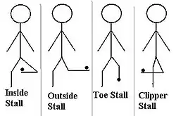 - Clipper or Jester (Chester) stall: The kicking foot is positioned behind the standing foot, and caught on the inside of the foot as in an inside stall. the name jester is often used by circle kickers.