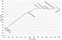 Due to the 85-meter Geiersgraben curve, Windbergbahn vehicles face restrictions. Rigid-axle vehicles (locomotives or carriages) are limited to a 3.00-meter axle base, while steering axle vehicles can have a 4.50-meter axle base.[32] Bogie wagons were permitted up to an 8.00-meter bogie pivot distance and a 2.60-meter overhang to buffer level.[31]