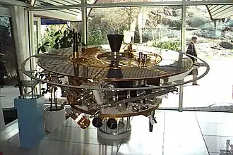 ![]() Mockup of the Freja satellite, in the entrance hall of the Swedish Space Corporation in Solna, Sweden | |