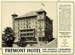 The hotel briefly appears in the background near the end of Charlie Chaplin's 1914 debut film, Making a Living, during a fight scene on the road.[7] The Fremont Hotel is also shown twice in the 1950 film noir feature Backfire starring Gordon MacRae and Virginia Mayo. George F. Fellows was arrested in his room in March 1927 for broadcasting on the radio.[8] Though it billed itself as "[t]he newest and most elegantly appointed family hotel in Los Angeles",[9] by 1948, the hotel was a dilapidated and ill maintained establishment.[2][4] The hotel was demolished by 1955 by the Community Redevelopment Agency, and what remained was only the retaining wall next to the Olive Public School.[4]