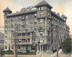 The hotel, located in the Bunker Hill suburb, was built and designed by the architect John C. Austin and developed by Thomas Pascoe. The plans for building the hotel were developed in November 1901 and initially faced resistance from the next door Olive Street School establishment.[1] It was designed by the architect in the Mission style, and had some 100 rooms.[2] It opened on September 9, 1902, and was named after John C. Frémont.[3] When newly built it was billed as "the newest and most elegantly appointed family hotel in Los Angeles.” [4] The hotel also held dinners in tribute to Frémont.[5] Frémont's widow, Jessie, was the first registered guest. She also designed and executed the hotel's crest. Frémont's motto, "Eternal vigilance is the price of safety" was adopted as the hotel's motto of the hotel, paraphrased into "Eternal vigilance is the price of success in the hotel business".[3] On 21 January 1903, the hotel was the venue of banquet organized in honour of John Freemont, (after whom the hotel was named) the builder of Los Angeles from the arid desert lands.[6]