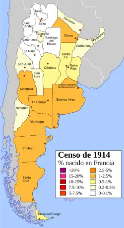 According to the 1869 census, a quarter of immigrants to the province of Mendoza were from France. In 1895, they made up 15% of immigrants of the province, right after Italians and Spaniards (26.1% and 17.3% respectively). Frenchmen were particularly numerous in the wine-producing departments of Maipú, Luján and in the French colony of San Rafael, founded by engineer Julio Gerónimo Balloffet.[20]