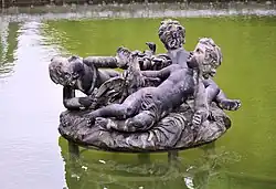 The French garden, of which the pavilion is the centerpiece, was created in 1749 by the architect Ange-Jacques Gabriel. It comprises a long lawn with flower borders, the regularity broken by two of the four basins.[20] These marble-edged pools, circular or square in shape, are arranged opposite each facade of the pavilion and are embellished with lead statues representing groups of three children playing with fish and waterfowl,[35] sculpted by Jules-Antoine Rousseau.[36] The long parallel avenues lined with poplars also delineate the green rooms set in bower beds, providing easy access to the chapel or the theatre.[20]