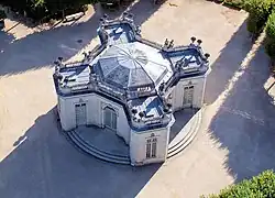 The pavilion is called "French" because of its location in the centre of the formal garden.[39] It is a model of Rococo architecture. Its plan is centred, in the shape of a St Andrew's cross. In fact, this motif is rendered by the outline of an octagon flanked by four rectangular hors d'oeuvre cabinets,[9] all set within a circular representation marked by the external steps. This perfect, centred plan follows in the footsteps of contemporary architects, while retaining only the essentials, giving the building a character that is more brilliant than grandiose.[40]
