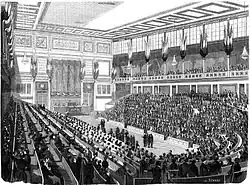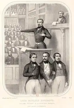 The new constitution, proclaiming a democratic republic, direct universal suffrage, and the separation of powers, was promulgated on 4 November 1848.[6] Under the new constitution, there was to be a single permanent Assembly of 750 members elected for a term of three years by the scrutin de liste. The Assembly would elect members of a Council of State to serve for six years. Laws would be proposed by the Council of State, to be voted on by the Assembly. The executive power was delegated to the president, who was elected for four years by direct universal suffrage, i.e. on a broader basis than that of the Assembly, and was not eligible for re-election. He was to choose his ministers, who, like him, would be responsible to the Assembly. Finally, a revision of the constitution was made practically impossible; it involved obtaining three times in succession a majority of three-quarters of the deputies in a special assembly. It was in vain that Jules Grévy, in the name of those who perceived the obvious and inevitable risk of creating, under the name of a president, a monarch and more than a king, proposed that the head of the state should be no more than a removable president of the ministerial council. Lamartine, thinking that he was sure to be the choice of the electors under universal suffrage, won over the support of the Chamber, which did not even take the precaution of rendering ineligible the members of families which had reigned over France. It made the presidency an office dependent upon popular acclamation.[5]